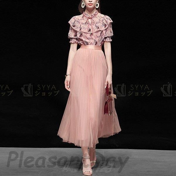 パーティードレス 結婚式 40代 30代 2点セット 韓国風 大きいサイズ ブラウス 半袖 花柄 シフォン ロングスカート チュール お呼ばれ 二次WP数量 価格926 WWW_GREEN-COOK_ORG