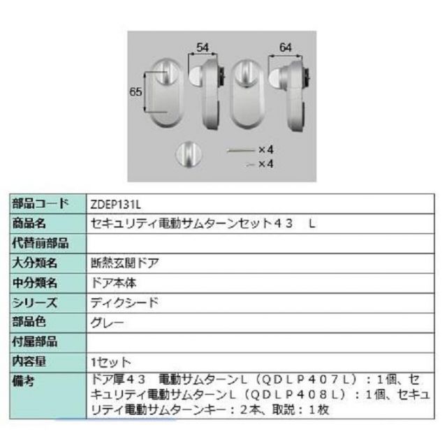 セキュリティ電動サムターンセット43 L 製品色 グレー ZDEP131L 交換用 部品 LIXIL リクシル TOSTEM トステムの検索結果